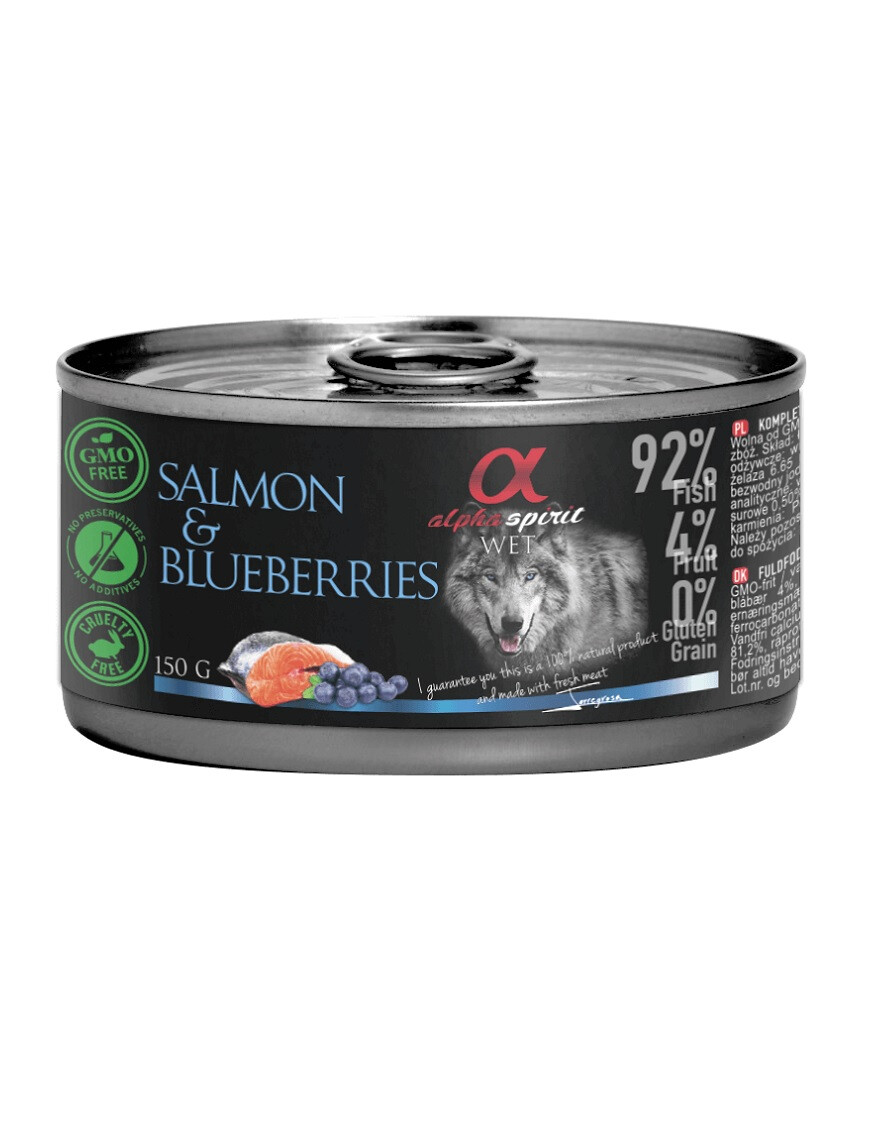 ALPHA SPIRIT konservai šunims su lašiša ir mėlynėmis - visavertis šlapias ėdalas visų veilsių šunims.