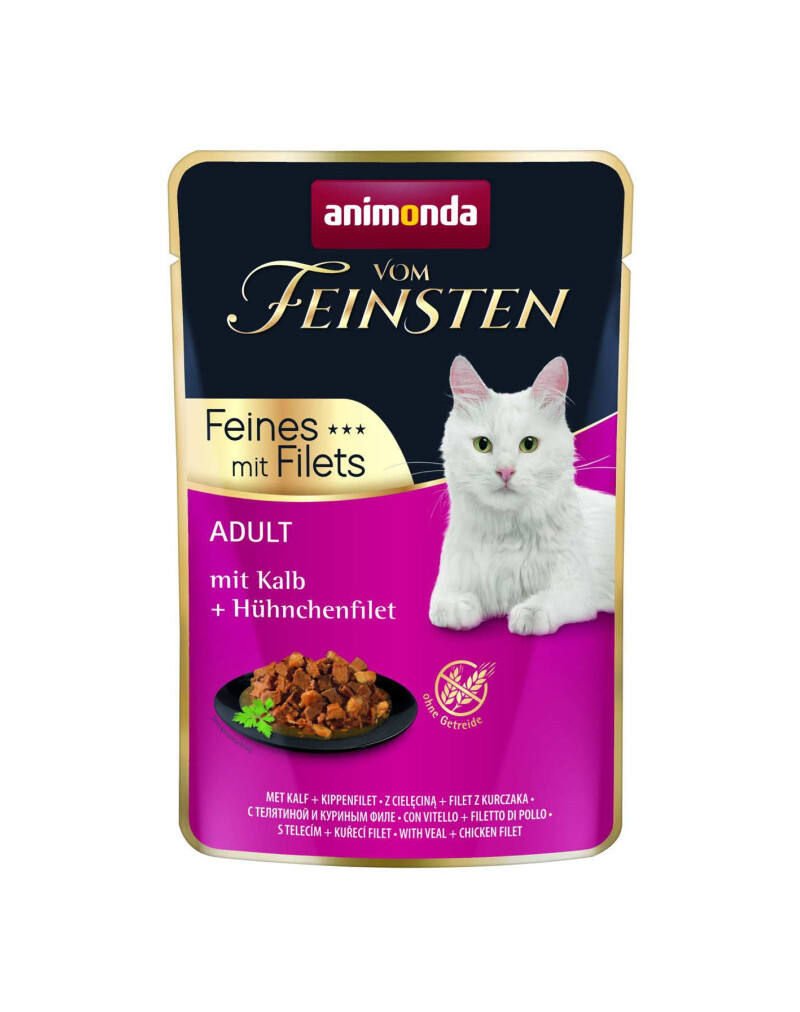 Vom Feinsten Adult Feines mit Filets – veršiena ir vištienos filėVom Feinsten Adult Feines mit Filets yra pilnavertis maistas, sukurtas suaugusioms katėms nuo 1 iki 6 metų, kuris sujungia