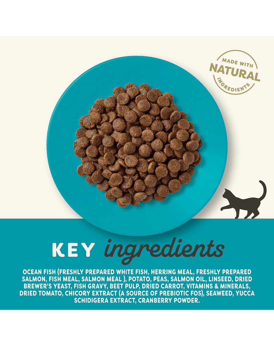 Jūros žuvys 45,5 % (šviežiai paruošta balta žuvis* 18 %, silkės miltai 12 %, šviežiai paruošta lašiša* 8 %, žuvų miltai 5 %, lašišos miltai 2,5 %), bulvės*, džiovinti žirniai*, lašišų taukai 5 %, sėmenys*, džiovintos alaus mielės*, žuvų padažas 2,5 %, vitaminai ir mineralai, burokėlių išspaudos*, džiovintos morkos*, džiovinti pomidorai*, trūkažolių ekstraktas* 0,2 % (prebiotiko FOS šaltinis), jūros dumbliai*, Schidigera jukos ekstraktas*, spanguolių milteliai. *Natūralūs ingredientai.