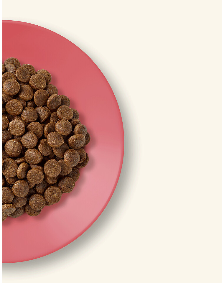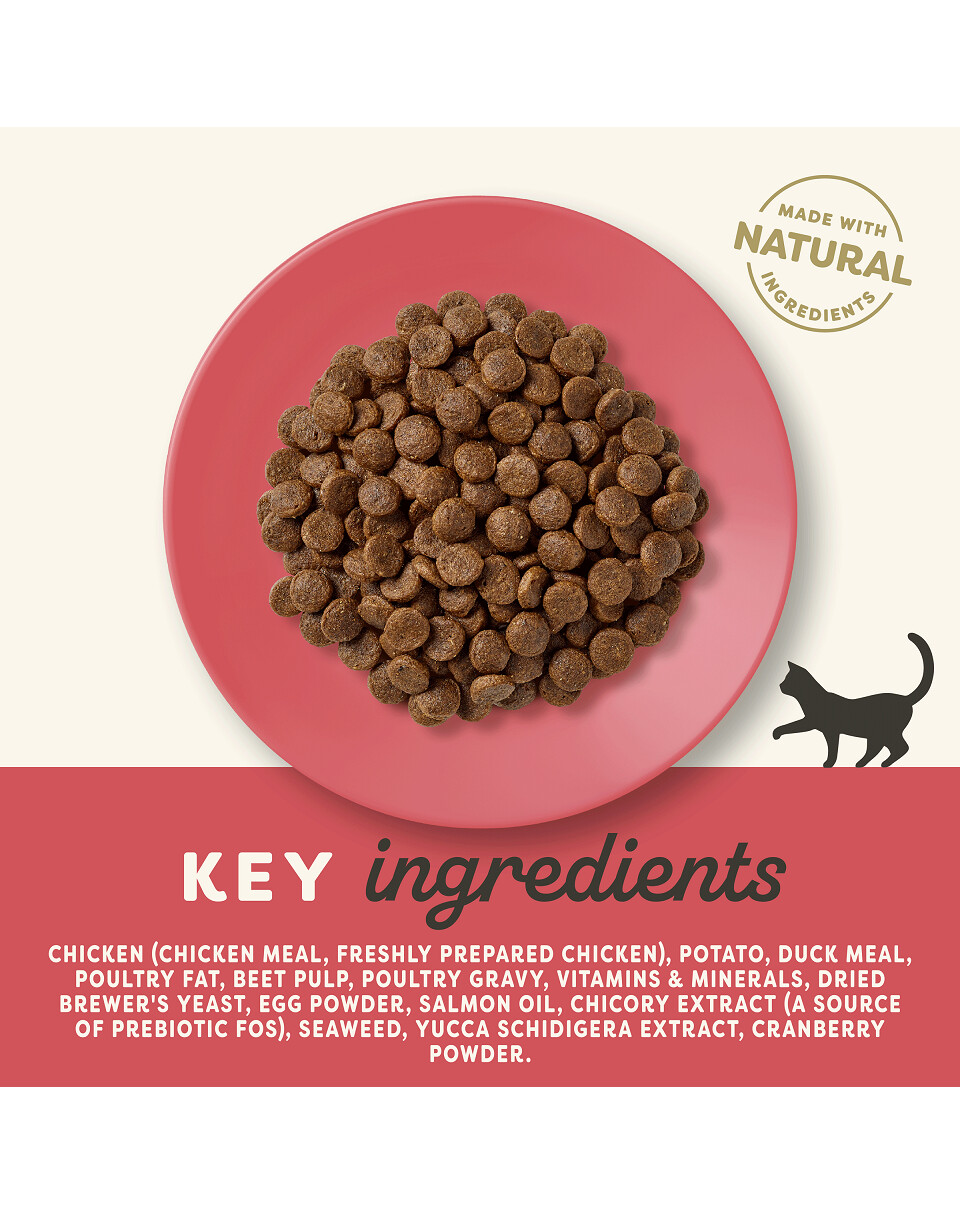 Vištiena 44 % (vištienos miltai 41 %, šviežiai paruošta vištiena* 3 %), bulvės*, paukštienos riebalai 8 %, antienos miltai 4 %, burokėlių išspaudos*, džiovintos alaus mielės*, vitaminai ir mineralai, paukštienos padažas 1,5 %, kiaušinių milteliai*, lašišos aliejus, trūkažolių ekstraktas* 0,2 % (prebiotiko FOS šaltinis), jūros dumbliai*, Schidigera jukos ekstraktas*, spanguolių milteliai. *Natūralūs ingredientai.