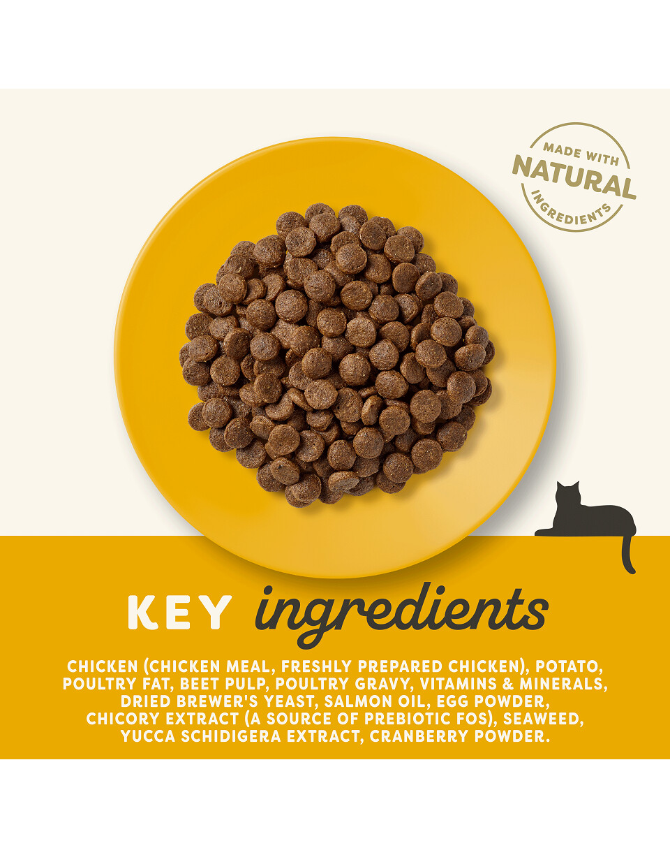 Vištiena 48 % (vištienos miltai 45 %, šviežiai paruošta vištiena* 3 %), bulvės*, paukštienos riebalai 6 %, burokėlių išspaudos*, džiovintos alaus mielės*, vitaminai ir mineralai, paukštienos padažas 1,5 %, kiaušinių milteliai*, lašišos aliejus, trūkažolių ekstraktas* 0,2 % (prebiotiko FOS šaltinis), jūros dumbliai*, Schidigera jukos ekstraktas*, spanguolių milteliai. *Natūralūs ingredientai.