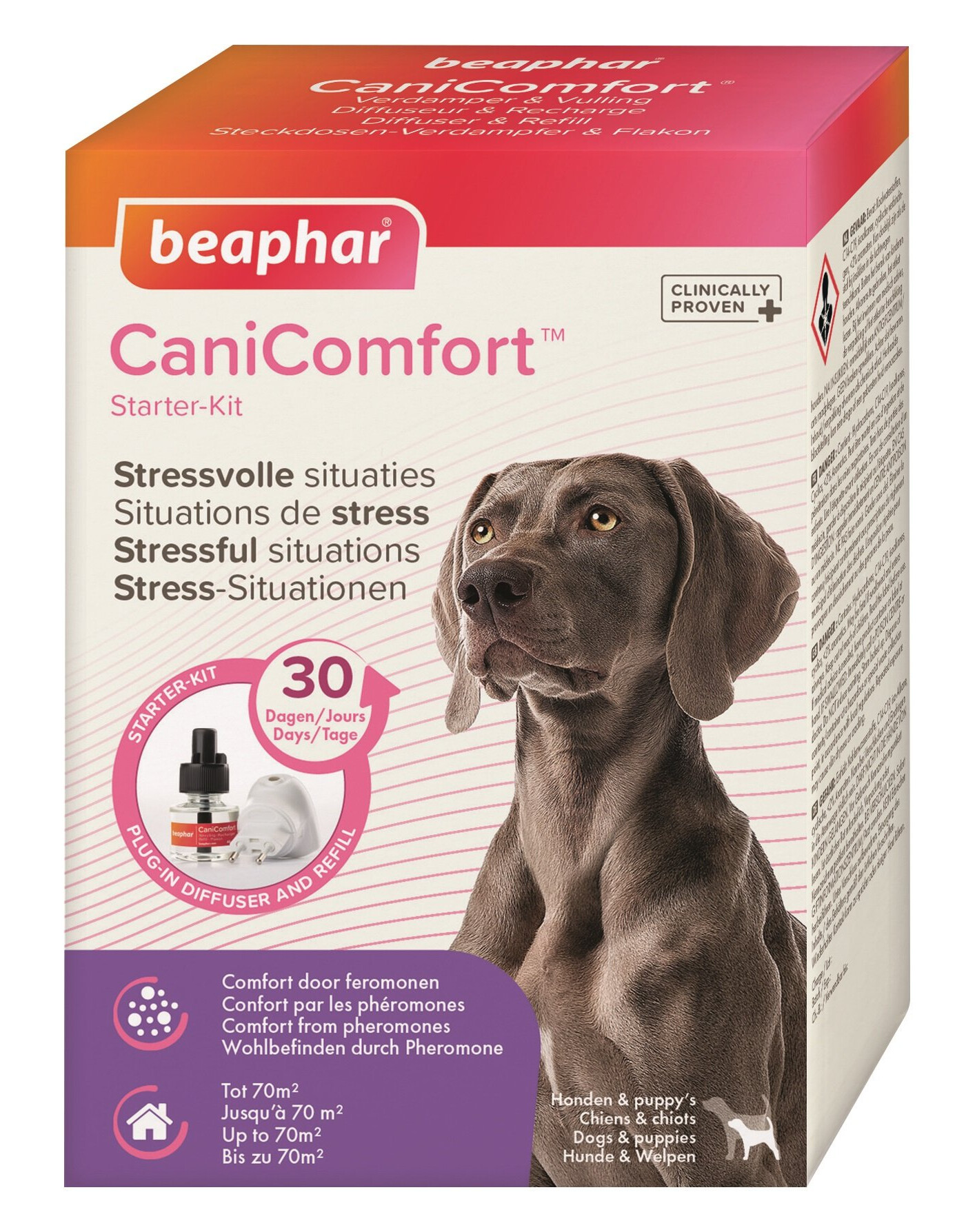 Beaphar CaniComfort sudėtyje esantys feromonai yra raminančių šunų feromonų, kuriuos natūraliai gamina šunų motinos, kai prižiūri savo šuniukus, kopijos, o tai yra pagrindinė suartėjimo proceso dalis. Kliniškai įrodyta, kad feromonai padeda šunims jaustis saugiai, nepriklausomai nuo to, ar jie yra šuniukai, ar suaugę šunys. Galioja iki 30 dienų. Beaphar CaniComfort difuzorius turėtų būti naudojamas patalpose, kuriose jūsų šuo praleidžia daugiausia laiko. Veiksmingas plotas - iki 70 kvadratinių metrų. Įrengtas su lengvai pasiekiamu kištuku.