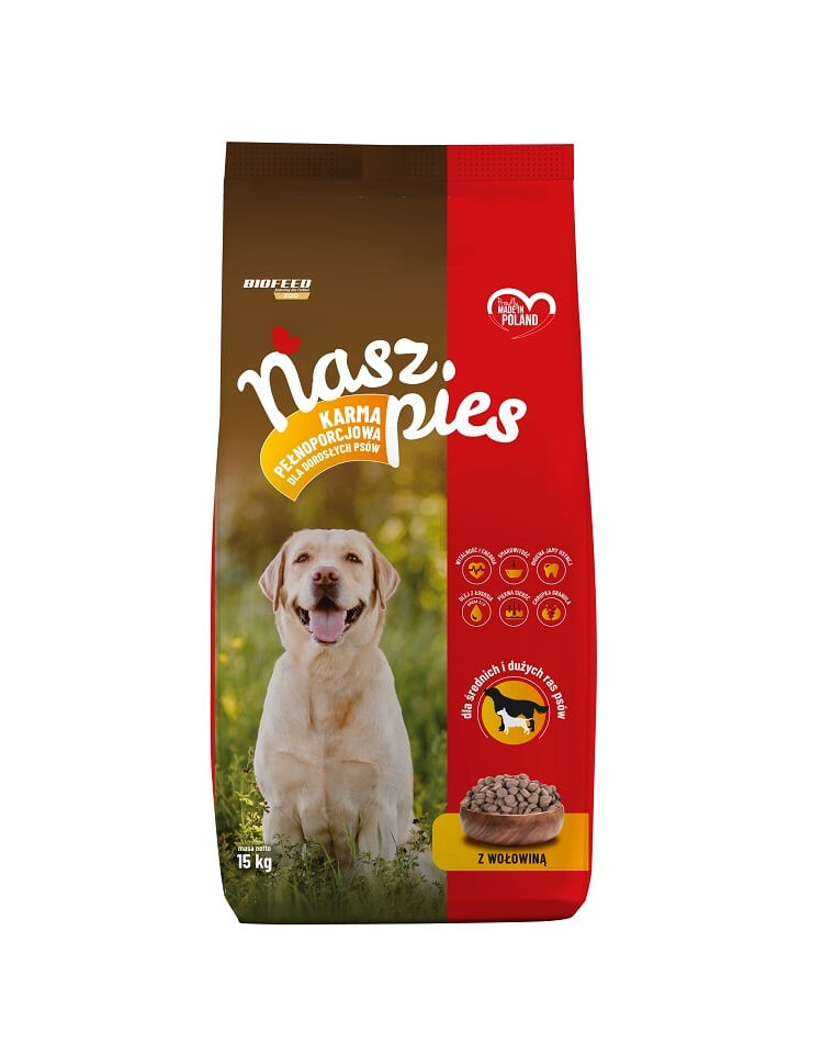„NASZ PIES” yra pilnavertis maistas suaugusiems šunims, siūlantis skanius granulius su jautiena. Tinkamai subalansuota formulė, praturtinta priedais, tokiais kaip burokėlių minkštimas ir lašišų aliejus, padeda palaikyti virškinimo sistemos veiklą bei kailio ir odos išvaizdą. Kieta, traški dalelių struktūra padeda išlaikyti burnos higieną ir sumažina dantų akmenų susidarymą.