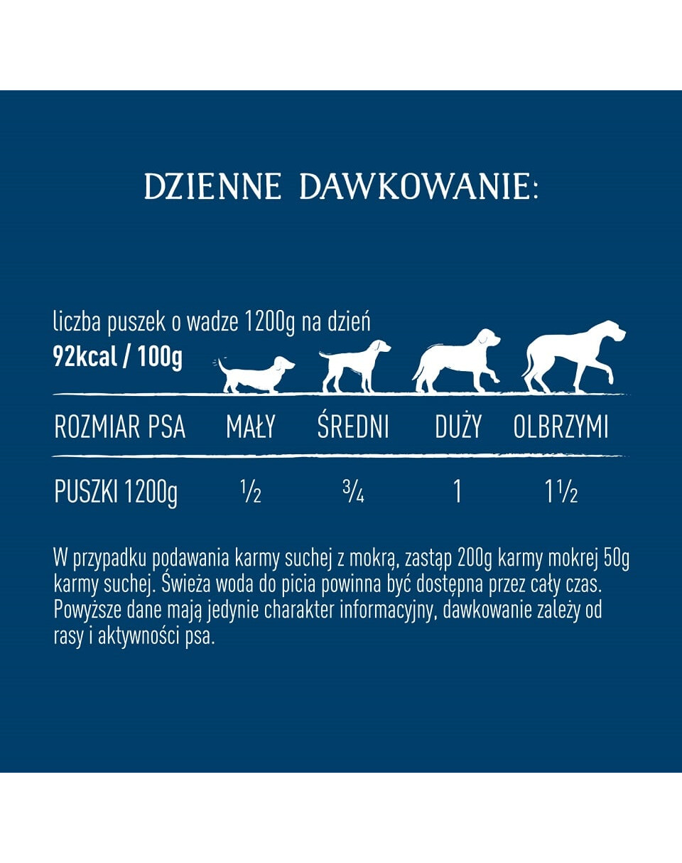 Dienos dozė (400 g skardinių skaičius per dieną) 85 kcal/100 g