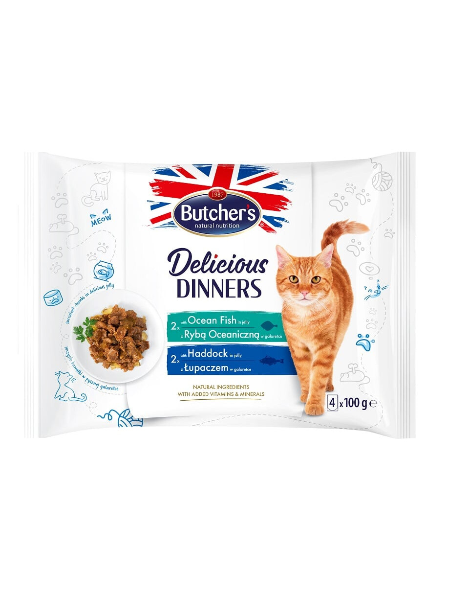 Šis visavertis ėdalas, patiekiamas sultingų gabalėlių pavidalu su aukščiausios kokybės vandenynų žuvimis ir juodadėmėmis (menkinių šeimos jūros žuvimis) skaniausioje drebučių konsistencijoje, tikrai pradžiugins jūsų augintinį. Natūralios kilmės ingredientų pagrindu sukurtas receptas praturtintas vitaminais ir mineralais, kurių reikia jūsų katės sveikam ir laimingam gyvenimui. Skonis, kuriam negalės atsispirti net didžiausias kačių valgytojas.