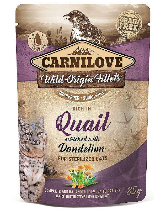 Visavertis drėgnas ėdalas be grūdų, su putpelių ir kiaulpienių pašaru suaugusioms katėms po sterilizacijos.