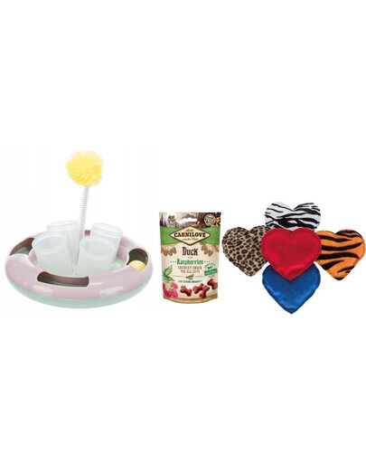 Visų kačių mėgstamų veiklų derinys. Žaisle yra turėklas, kuriame yra kamuoliukas, pompastika ir vieta skanėstams paslėpti.
