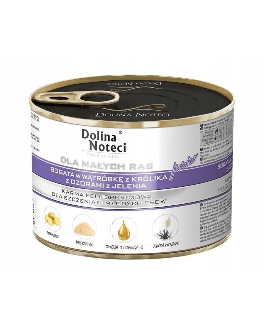 Šis maistas išsiskiria didele lengvai virškinamų baltymų verte ir yra idealus visaverčių baltymų šaltinis. Triušienoje ir elnieno mėsoje gausu vitaminų, kurie palaiko šuns imuninę sistemą, nes joje yra geležies, seleno, vario ir cinko. Jie taip pat padeda palaikyti puikią jūsų augintinio odos ir kailio būklę. Šiame maiste, kaip ir kituose "Dolina Noteci PREMIUM" linijos produktuose, rasite vitaminų B6, B12, niacino ir kalio.