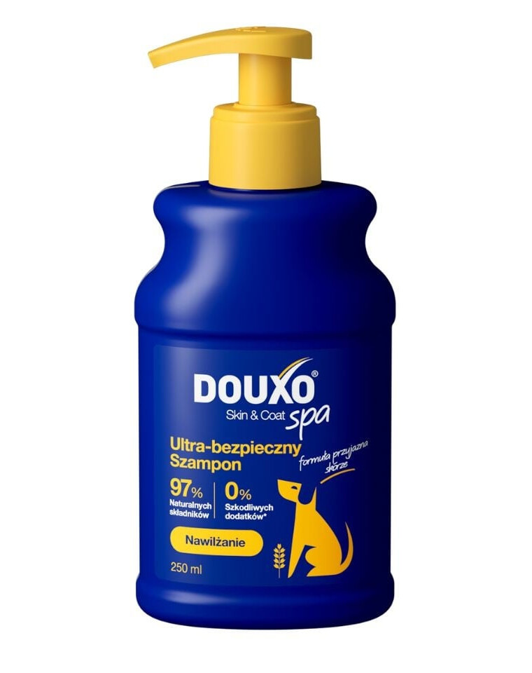 DOUXO Skin & Coat SPA – Ultra-saugus drėkinamasis šampūnas šunims. Valo ir intensyviai drėkina odą, pabrėžia kailio blizgesį, palieka jį minkštą ir blizgantį. Formulė draugiška odai.