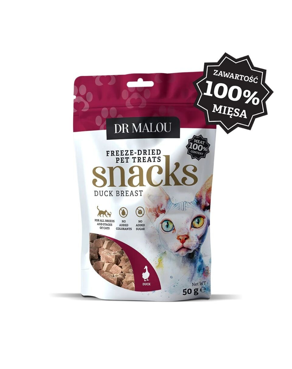 Unikalūs, sveiki ir natūralūs skanėstai jūsų katei! Liofilizuoti kubeliai Dr Malou yra papildoma dieta, kurios sudėtis kalba pati už save – 100% mėsos iš antienos krūtinėlės. Be nereikalingų priedų, konservantų, dažiklių, grūdų ir cukraus. Tik gryna kokybė ir pilna maistinių medžiagų!