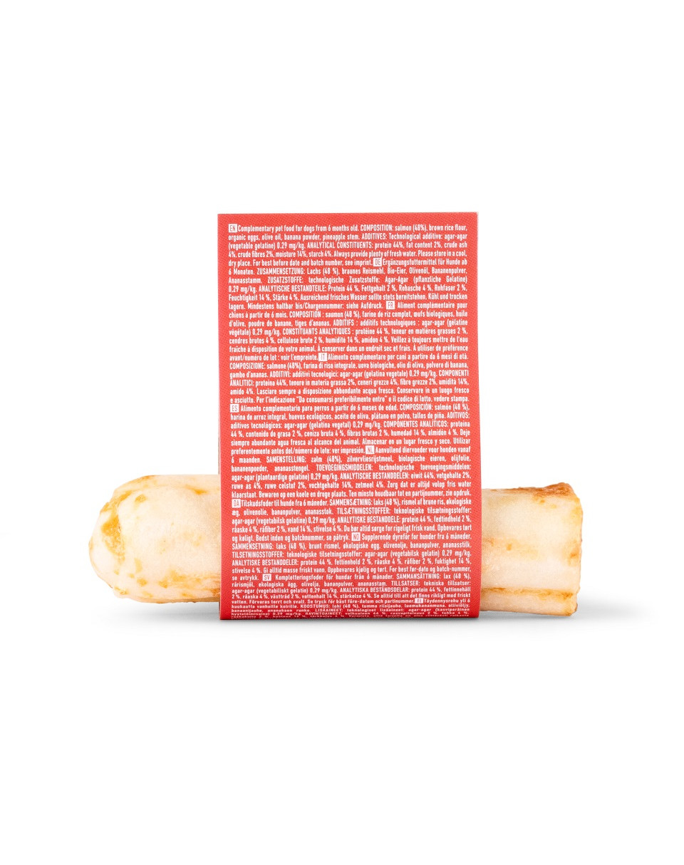 SUDEDAMOSIOS DALYS: lašiša (48 %), rudųjų ryžių miltai, ekologiški kiaušiniai, alyvuogių aliejus, bananų milteliai, ananasų stiebai.