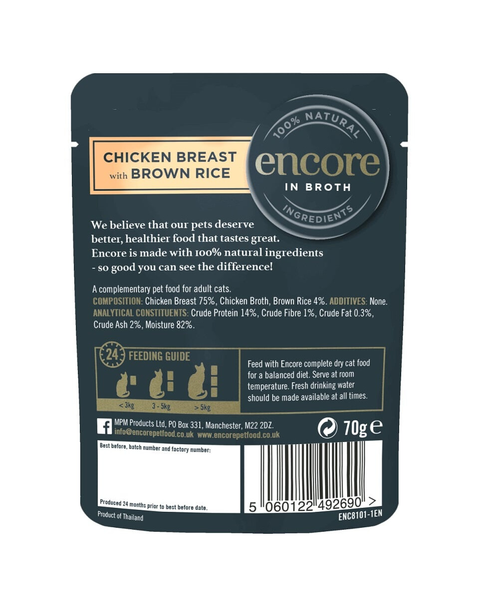 Kiekvienoje porcijoje gardžiai gausu baltymų ir omega 6 riebalų rūgščių, padedančių jūsų katei išlaikyti sveiką ir blizgantį kailį. Viskas, kas patenka į "Encore" maistą, yra kruopščiai, etiškai ir tvariai gaunama. Nededame ir neslepiame nieko dirbtinio, jokių dažiklių, skonių ar konservantų. Užtikriname, kad "Encore" receptai būtų be grūdų, glitimo ir hipoalergiški, todėl tai puikus pasirinkimas išrankiems valgytojams ar jautriems skrandžiams - jūsų katės dubenėlis visada bus švariai išlaižytas.