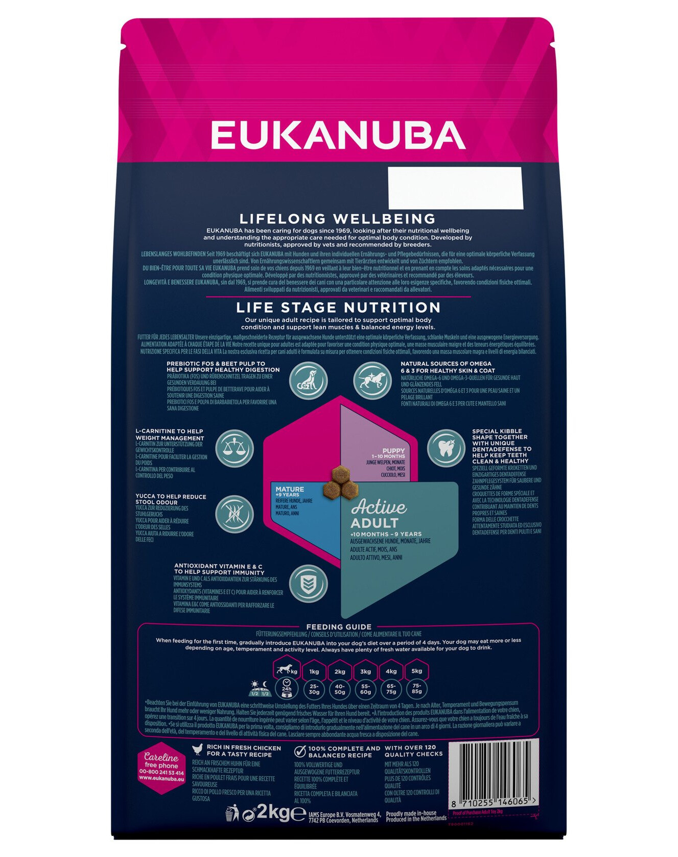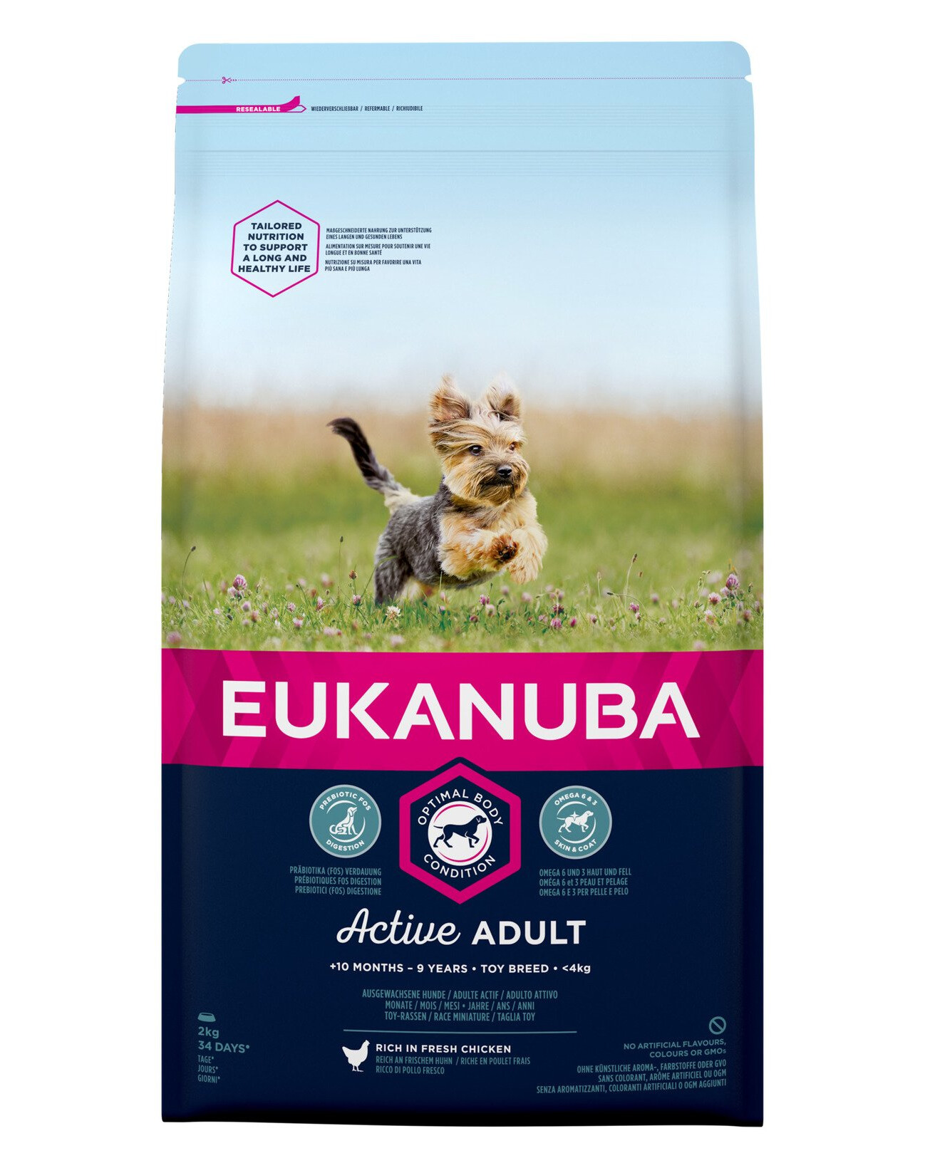 Nauja ir patobulinta EUKANUBA receptūra pritaikyta prie šuns gyvenimo etapo. 100 % visavertis ėdalas suaugusiems miniatiūrinių veislių šunims (Active Adult), kurių amžius nuo 10 mėnesių iki 9 metų, užtikrina mitybą, palaikančią optimalią kūno būklę.