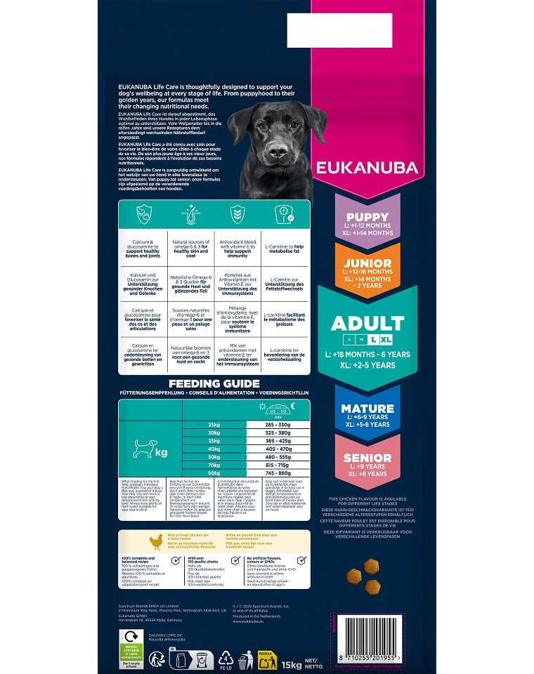 EUKANUBA Life Care yra premium maisto linija, sukurta remiantis moksliniais tyrimais, siekiant palaikyti šunų poreikius kiekviename gyvenimo etape. Variantą Adult Large Breeds Chicken sukūrėme suaugusiems didelių veislių šunims, kurių amžius yra 18 mėnesių – 6 metai, ir milžiniškų veislių šunims, kurių amžius yra 2–5 metai.
