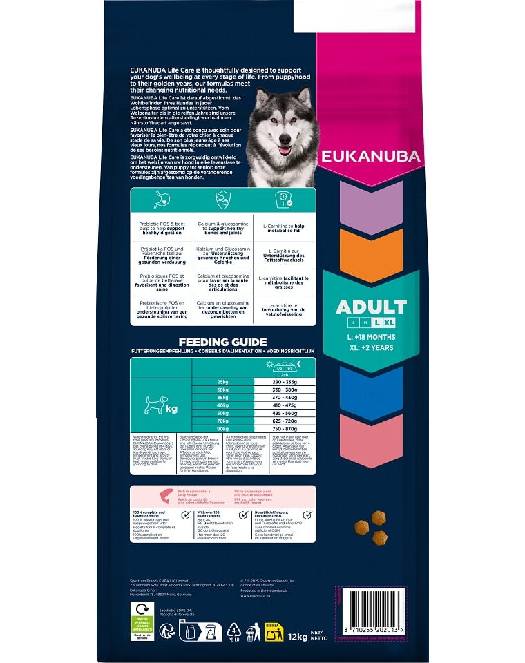EUKANUBA Life Care yra premium maisto linija, sukurta remiantis moksliniais tyrimais, kuri palaiko šuns sveikatą kiekviename gyvenimo etape. Šis maistas sukurtas suaugusiems dideliems šunims (nuo 18 mėnesių, milžiniškoms veislėms nuo 2 metų), užtikrinant jiems pilnavertį ir lengvai virškinamą maistą. Granulės, turinčios lašišos ir miežių, suteikia lengvai įsisavinamo baltymo ir energijos, palaikydamos aktyvumą ir sveiką būklę.
