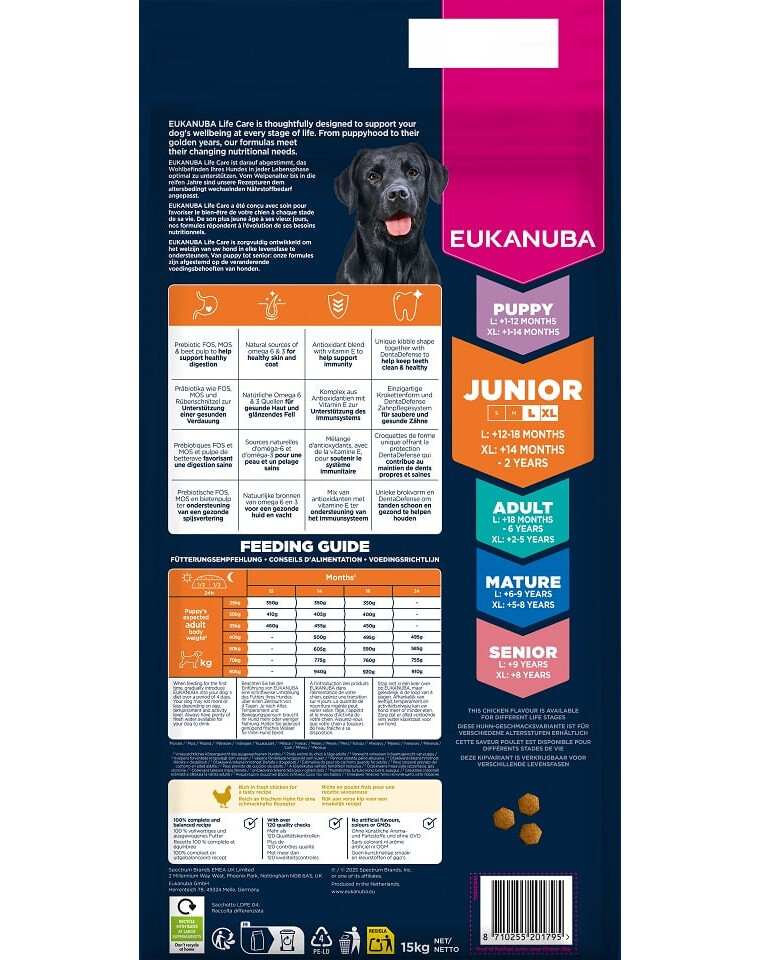 Sausa maistas EUKANUBA jauniems šunims, turintis šviežio vištienos, yra 100% pilnas ir subalansuotas, idealus didelių veislių šunims nuo 12 iki 18 mėnesių (nuo 14 mėnesių iki 2 metų milžiniškoms veislėms).