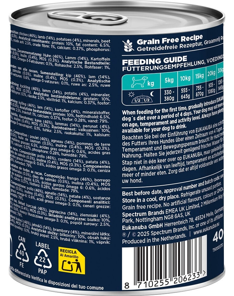 Sudėtis: vištiena (46%), aviena (14%), bulvės (4%), mineralai, burokėlių minkštimas (0.5%), lašišų aliejus (0.5%), inulinas (0.4%), MOS (0.3%).