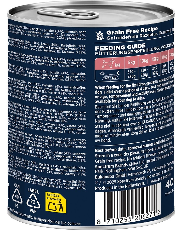Sudėtis: vištiena (41%), aviena (14%), bulvės (4%), mineralai, cukrinių runkelių minkštimas (0.5%), lašišų aliejus (0.5%), inulinas (0.4%), MOS (0.3%).