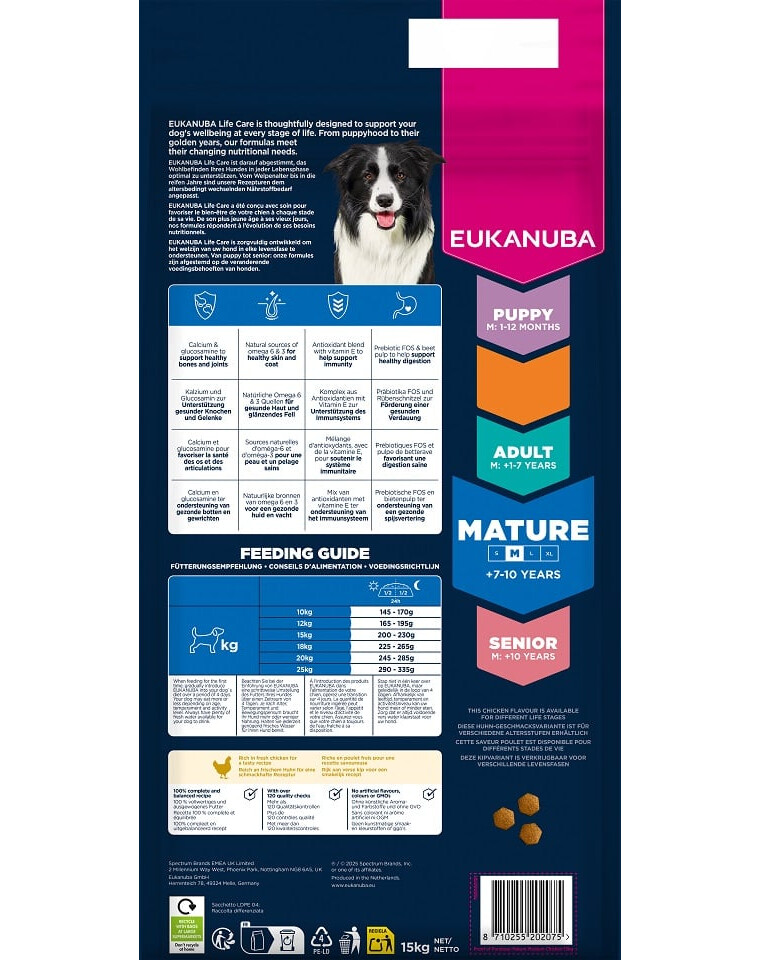 EUKANUBA Life Care yra premium maisto linija, sukurta remiantis moksliniais tyrimais, kuri palaiko šuns sveikatą kiekviename gyvenimo etape. Šis maistas buvo sukurtas subrendusiems vidutinio dydžio šunims, kurių amžius 7–10 metų, teikiant vertingą baltymą iš šviežio vištienos ir visavertę maistinę medžiagą, palaikančią gyvybingumą ir sveiką senėjimą.