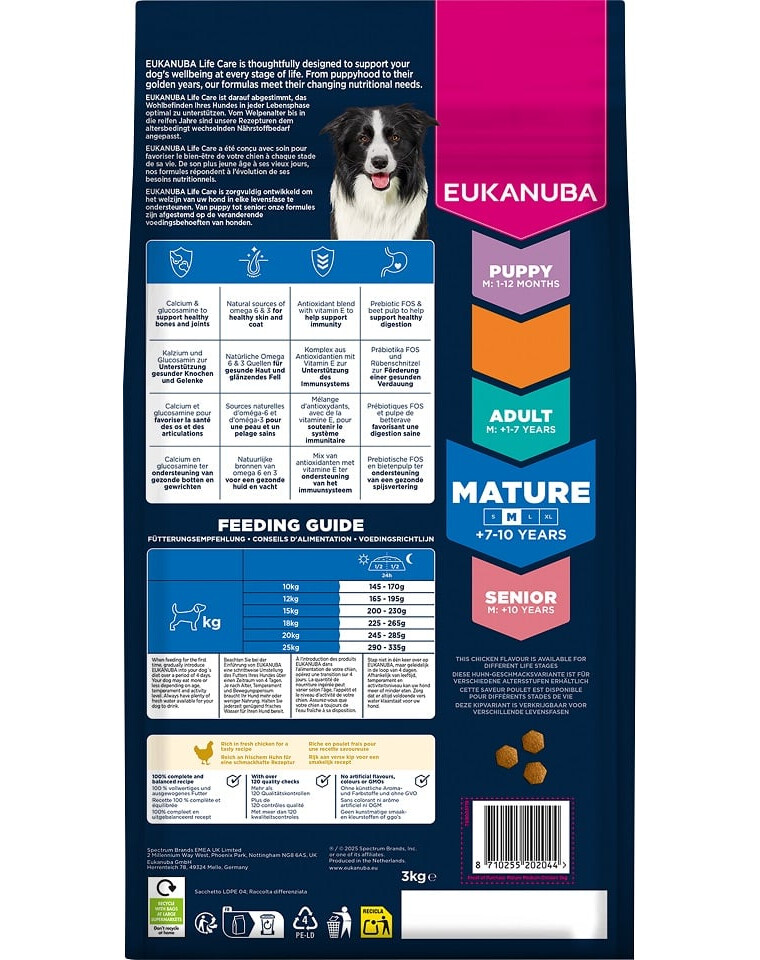Šis sausa maistas EUKANUBA suaugusiems šunims, turintis šviežio vištienos, yra 100% pilnas ir subalansuotas bei idealus vidutinio dydžio veislėms, kurių amžius 7–10 metų.