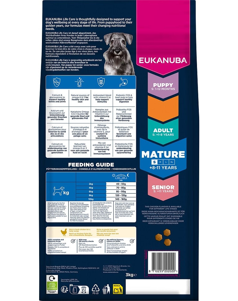 EUKANUBA suaugusiems šunims, turintis šviežio vištienos, yra 100% pilnas ir subalansuotas sausas maistas, idealus mažų veislių šunims, kurių amžius 8–11 metų, teikiantis aukštos kokybės baltymų, palaikančių raumenų jėgą ir tinkamą organizmo būklę.