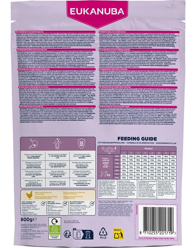 Šis sausa maistas EUKANUBA šuniukams, turintis šviežio vištienos, yra 100% pilnas ir subalansuotas bei idealiai tinka didelėms veislėms, kurių amžius yra 1–12 mėnesių (arba 1–14 mėnesių milžiniškoms veislėms).