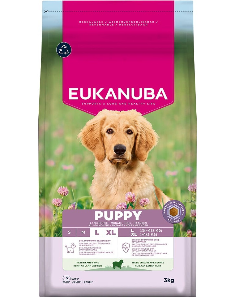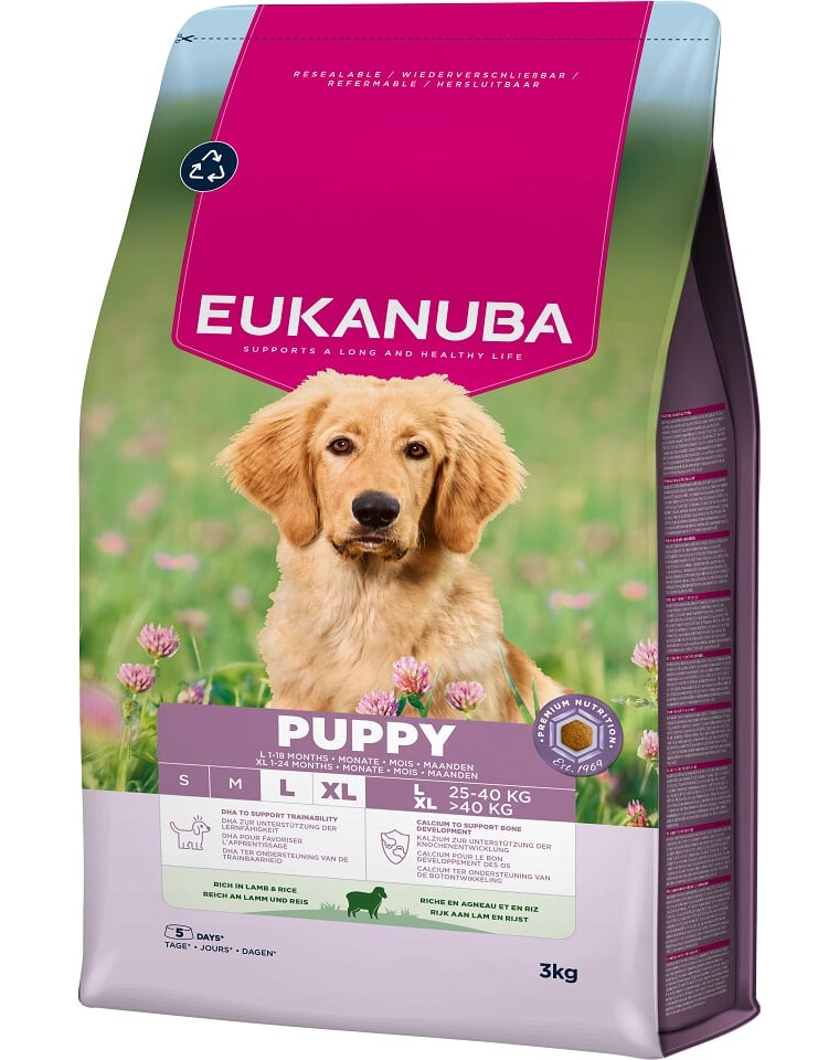 Šis sausa maistas EUKANUBA šuniukams, turintis avienos ir ryžių, yra 100% pilnas ir subalansuotas bei idealiai tinka didelių veislių šuniukams nuo 1 iki 18 mėnesių (ir iki 24 mėnesių milžiniškoms veislėms).