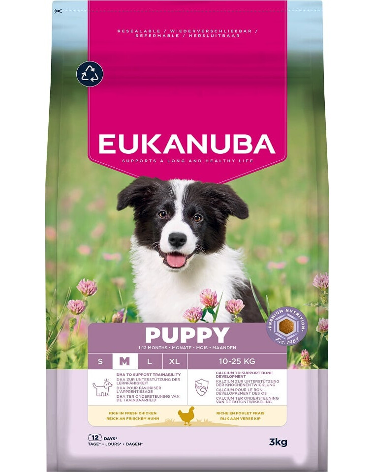 EUKANUBA Puppy Medium Breeds Chicken – sausa maistas vidutinių veislių šuniukams, turintis šviežio vištienos