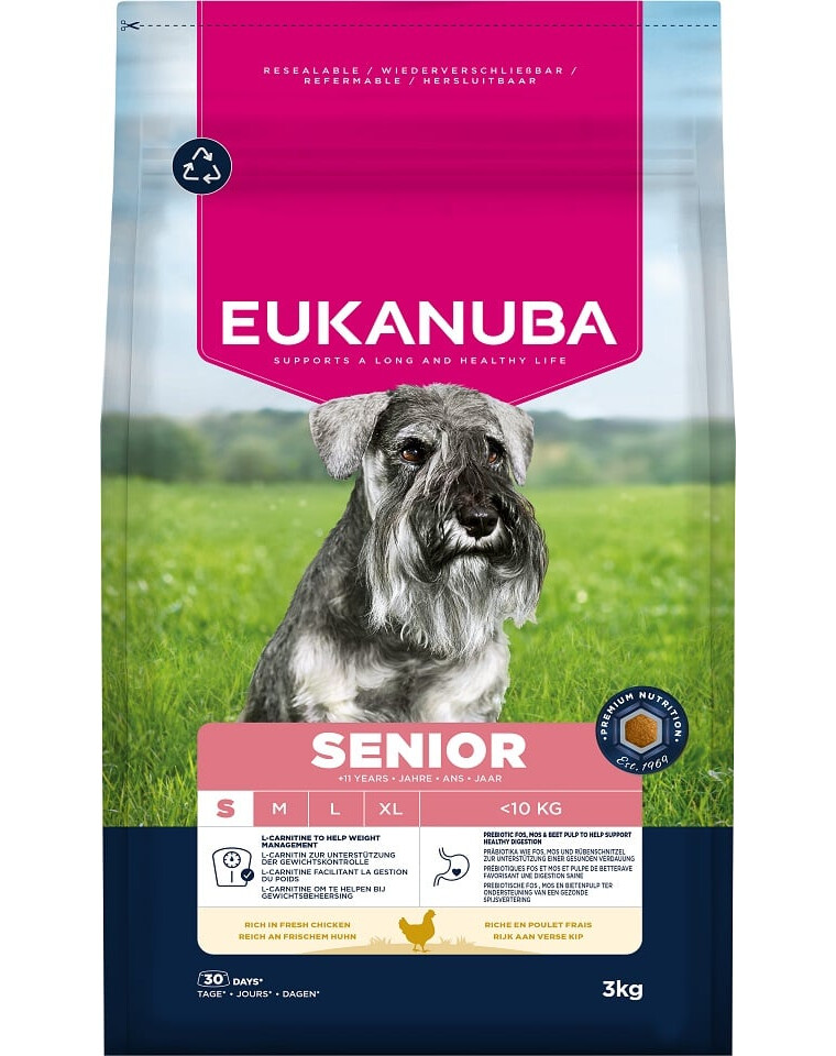 Šis sausas maistas EUKANUBA vyresniems šunims, turintis šviežio vištienos, yra 100% pilnas ir subalansuotas bei idealiai tinka mažų veislių šunims, vyresniems nei 11 metų.