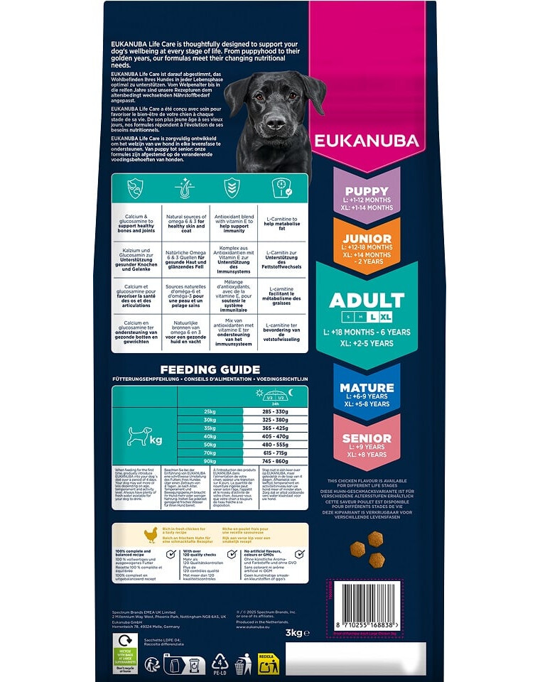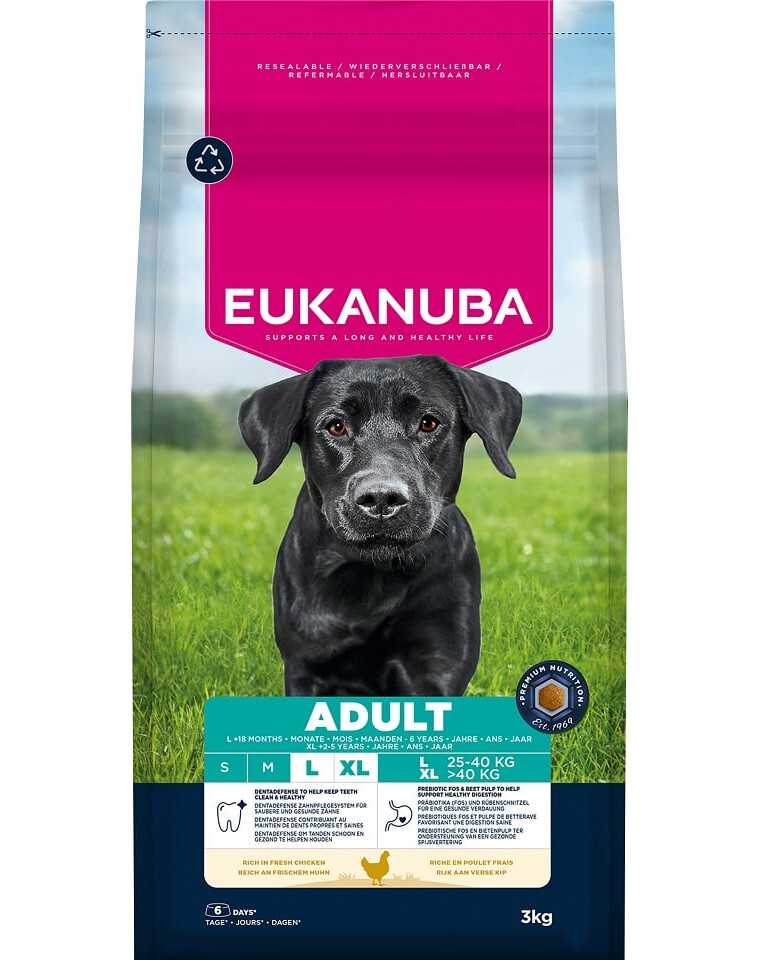 Suhų maistas EUKANUBA suaugusiems šunims, turintis vištienos, yra 100% pilnas ir subalansuotas, idealiai tinkantis didelių veislių šunims nuo 18 mėnesių iki 6 metų (arba 2–5 metų milžiniškoms veislėms).
