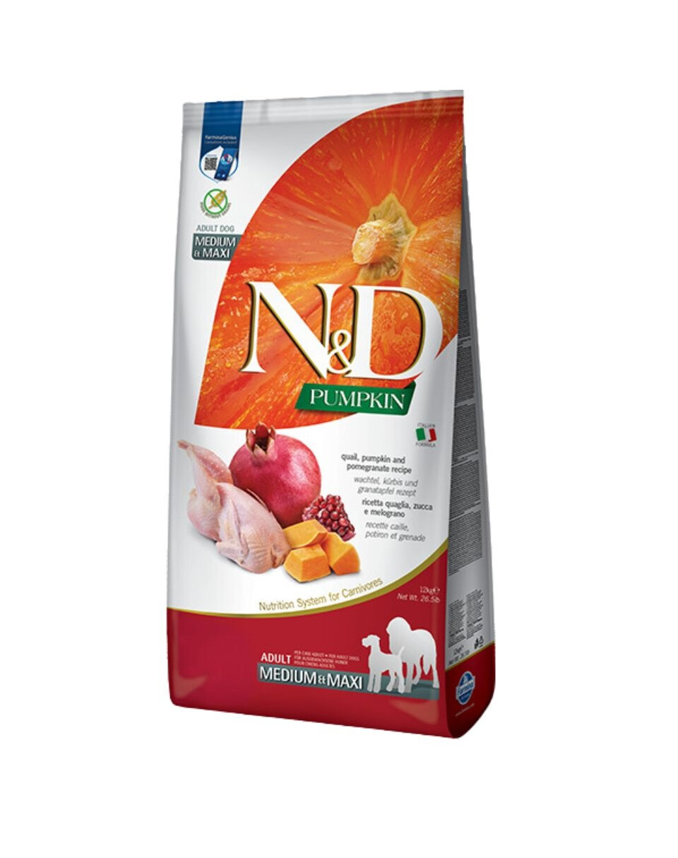 Visavertis pašaras suaugusiems šunims su putpelių, moliūgų ir granatų vaisiais.