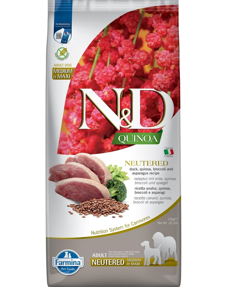 Sudėtyje nėra glitimo, jos pagrindą sudaro antis, kvinojos ir daržovės. Kvinoja palengvina virškinimą ir maistinių medžiagų įsisavinimą. Tai nepakeičiamų aminorūgščių, mineralų ir antioksidantų šaltinis, todėl padeda išvengti širdies ir kraujagyslių ligų. Tai glitimo neturintis produktas, kurio glikemijos indeksas yra žemas. Antis yra puikus gyvūninių baltymų šaltinis. Sudėtyje esančios daržovės suteikia reikiamą kiekį ląstelienos, maistingųjų medžiagų, vitaminų ir mineralų, kad būtų užtikrinta tinkama būklė ir išlaikytas svoris po kastracijos.