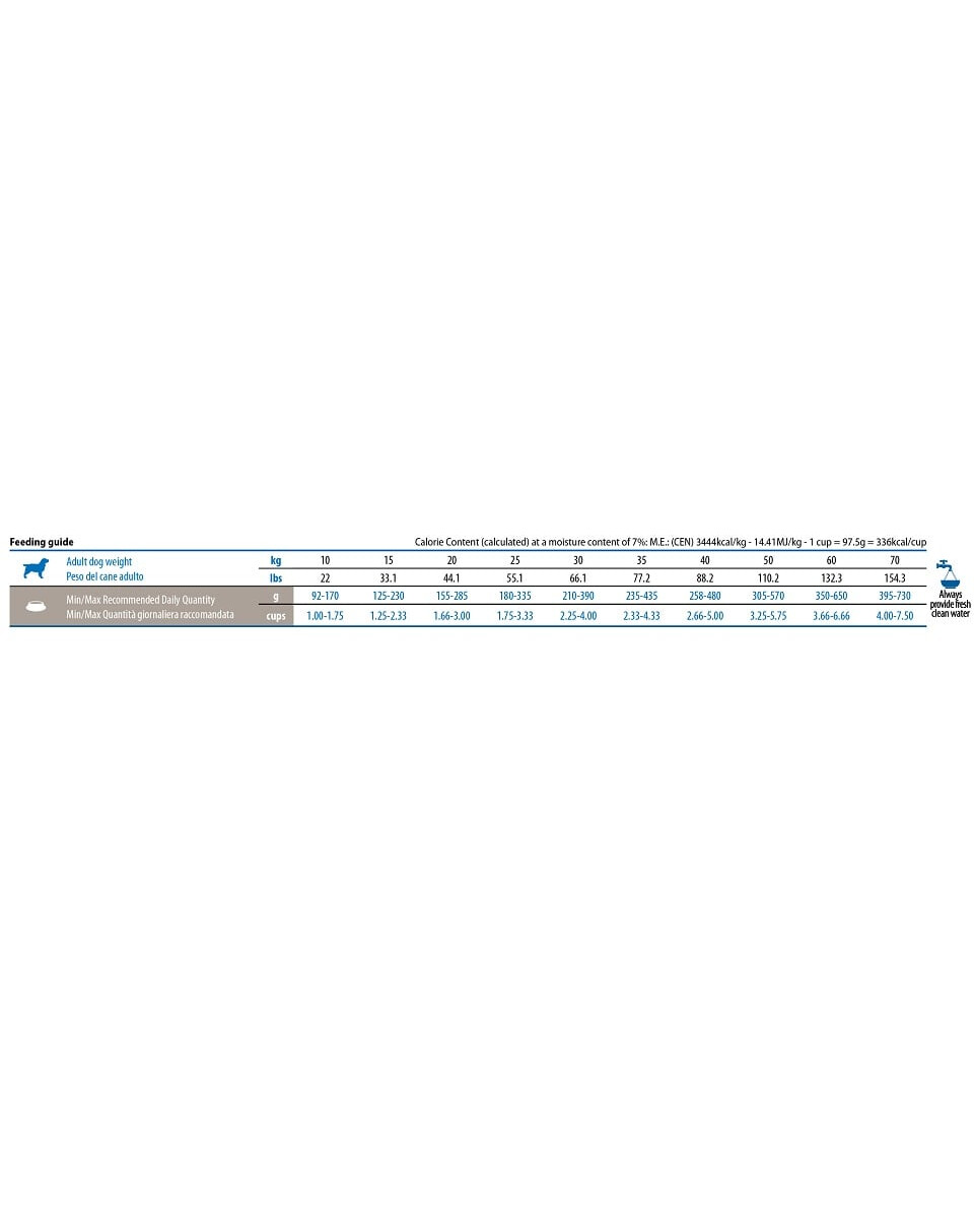 Žali baltymai 30,00 %; žali riebalai 11,00 %; žalioji ląsteliena 5,70 %; drėgmė 9,00 %; žali pelenai 7,80 %; kalcis 1,20 %; fosforas 0,90 %; kalis 0,90 %; kalio 0. 60%; natris 0,35%; magnis 0,10%; omega-6 riebalų rūgštys 2,00%; omega-3 riebalų rūgštys 0,30%; DHA 0,10%; EPA 0,05%; gliukozaminas 1200mg/kg; chondroitino sulfatas 900mg/kg.
