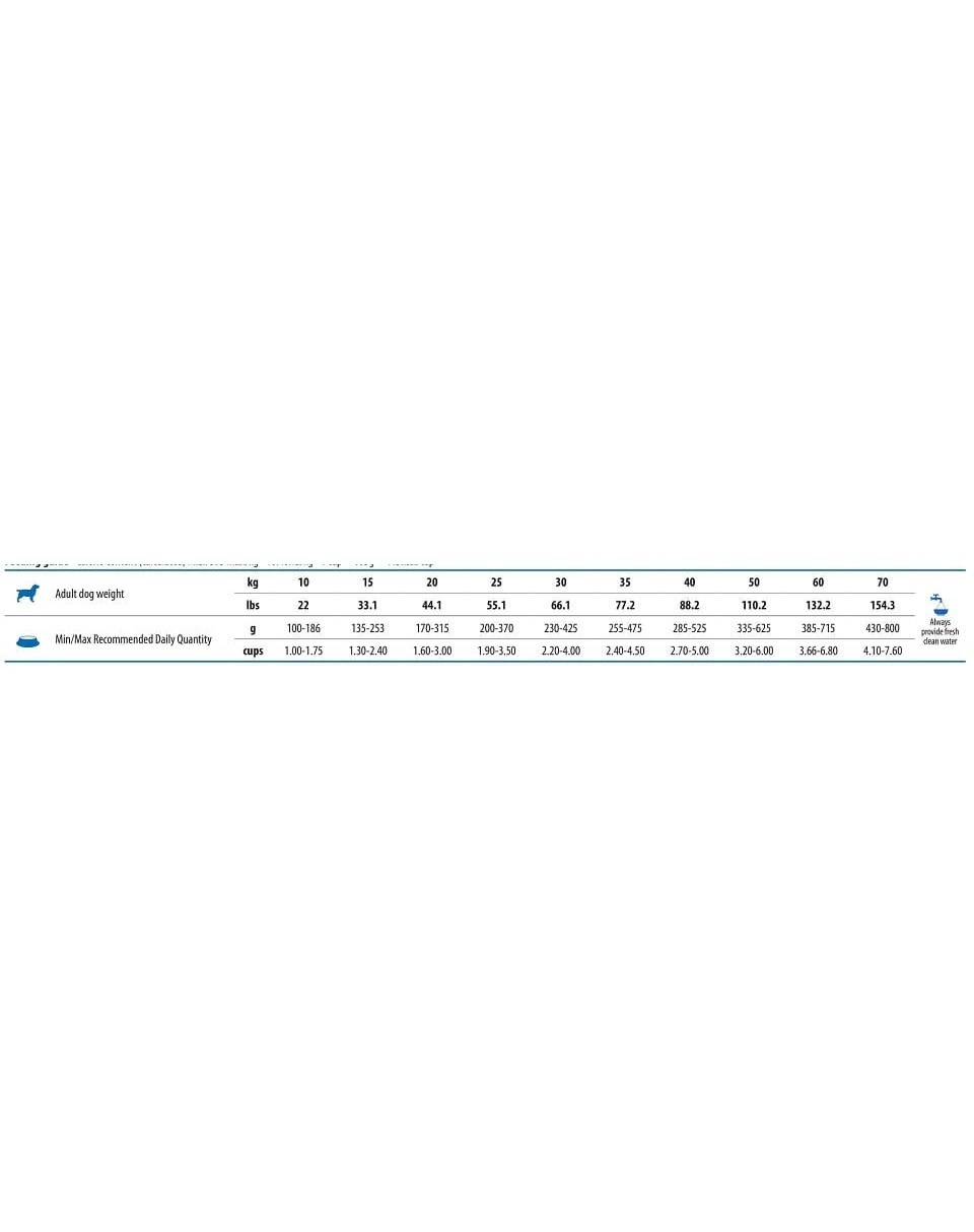 Pasirūpinkite, kad gyvunas visada turėtų pakankamai šviežio vandens prieinamoje vietoje . Šuns dienos maisto norma gali skirtis atsižvelgiant į jo dydį, amžių, aktyvumą ir laikymo sąlygas. Tikslias rekomendacijas rasite ant pakuotės.