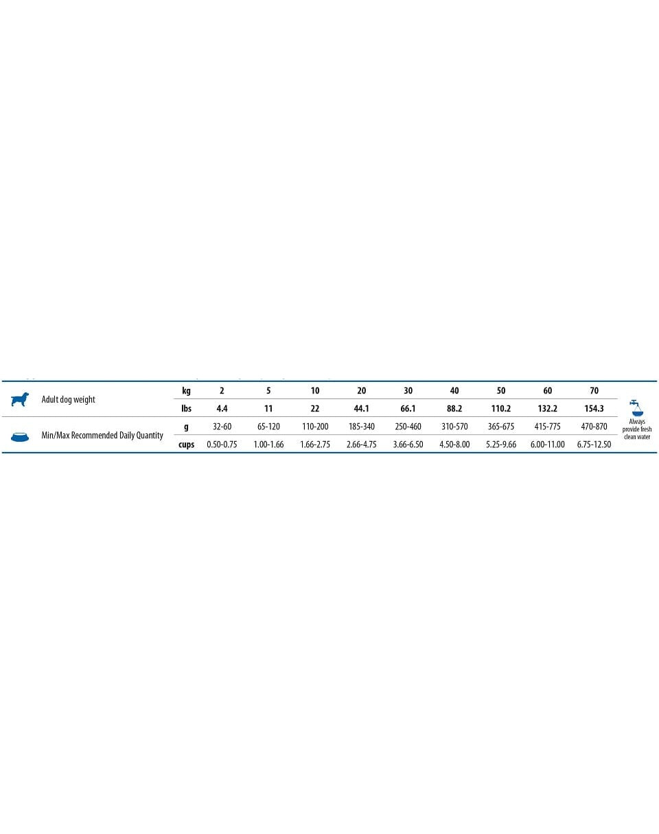 Pasirūpinkite, kad gyvunas visada turėtų pakankamai šviežio vandens prieinamoje vietoje . Šuns dienos maisto norma gali skirtis atsižvelgiant į jo dydį, amžių, aktyvumą ir laikymo sąlygas. Tikslias rekomendacijas rasite ant pakuotės.
