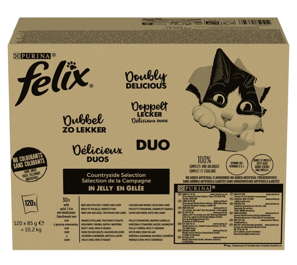 Felix Fantastic DUO Mix Kaimo Skoniai želė yra visiškai subalansuotas drėgnas maistas suaugusioms katėms, siūlantis dviejų skonių derinius kiekviename valgyme: jautienos ir paukštienos, kalakutienos ir kepenėlių, vištienos ir inkstų bei antis ir avienos.