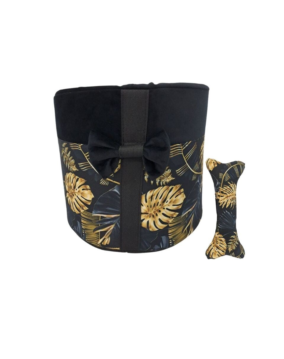 Žaislų krepšelis turi iš specialių putų pagamintus paminkštintus šonus. Jis aptrauktas audiniu su aukso lapelių raštu. Jis dera prie bet kokio interjero ir suteikia jam atmosferos bei charakterio.
