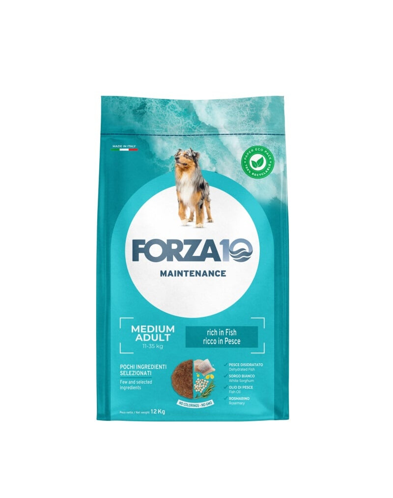 "Forza10 Medium Maintenance Fish" yra pagrindinis žuvų maistas vidutinių veislių šunims, sukurtas taip, kad užtikrintų optimalią jūsų šuns sveikatą. Jame yra vienas grynų baltymų šaltinis (vandenyno žuvys) ir grynas angliavandenių šaltinis (kukurūzai, baltosios sorgos, ryžiai), kad būtų sumažinta maisto alergijos rizika. Rekomenduojama šunims, netoleruojantiems intensyviai auginamos mėsos.