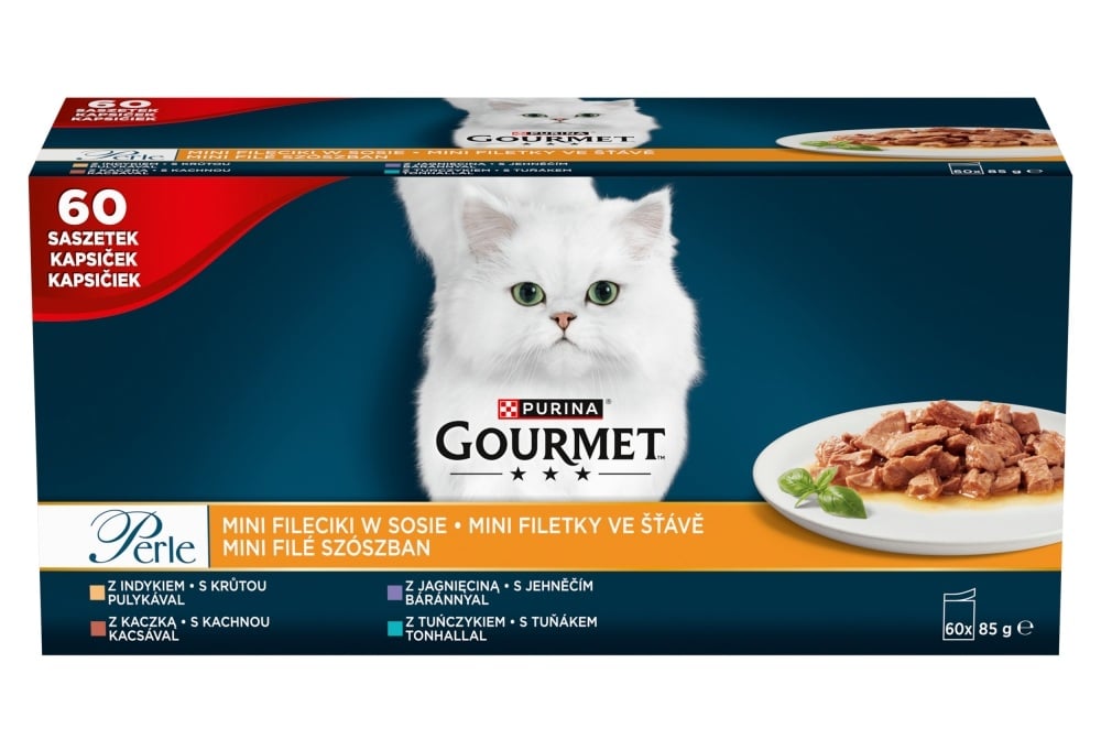 GOURMET Perle Mini Fileciki w sosie yra visiškai subalansuotas drėgnas maistas suaugusioms katėms, siūlantis rafinuotus skonius: indėno, antis, avienos ir tuno.