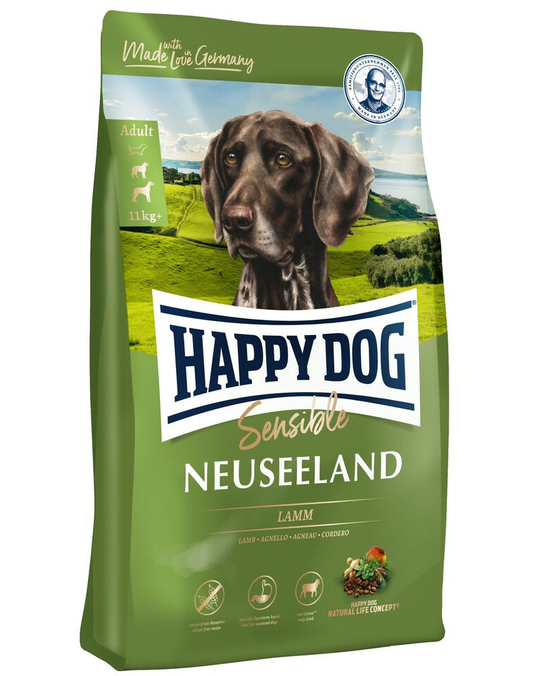 Happy Dog Neuseeland – subalansuotas pilnavertis sausas visų veislių suaugusių (nuo 11 kg svorio) šunų pašaras. Pašaras pagamintas pagal specialų receptą, tad yra itin gardus ir gerai toleruojamas. Dėl savo specialios receptūros šis ėdalas patiks ir maistui išrankiems šunims.
