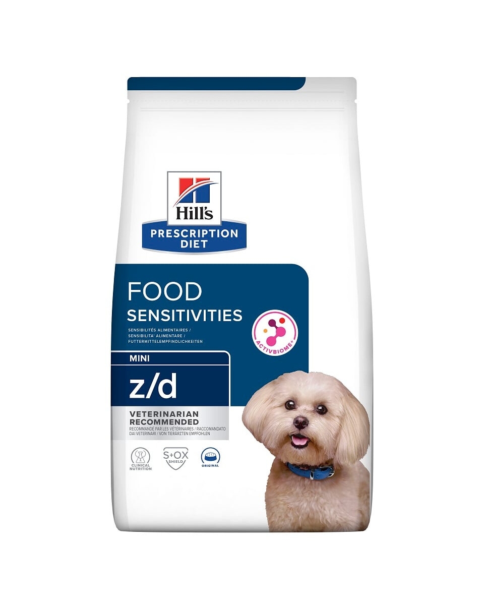 Sausa maistas Hill's PRESCRIPTION DIET z/d Food Sensitivities mažiems šunims buvo specialiai sukurtas dietologų ir veterinarų Hill's siekiant sumažinti maisto netoleravimą šunims ir yra specialiai pagamintas mažesnio dydžio granulių, kad atitiktų mažesnių šunų ar šunų, kurie pageidauja mažesnių granulių, poreikius.