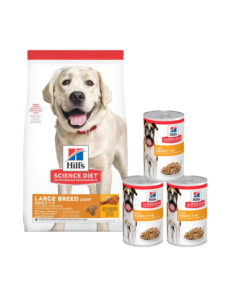 "Hill's Science Diet Large Breed Light Adult" yra tiksli mityba, skirta mažiau aktyviems suaugusiems didelių veislių šunims, kuriems reikia mažo kaloringumo dietos, kad išlaikytų sveiką svorį ir gyvenimo būdą.