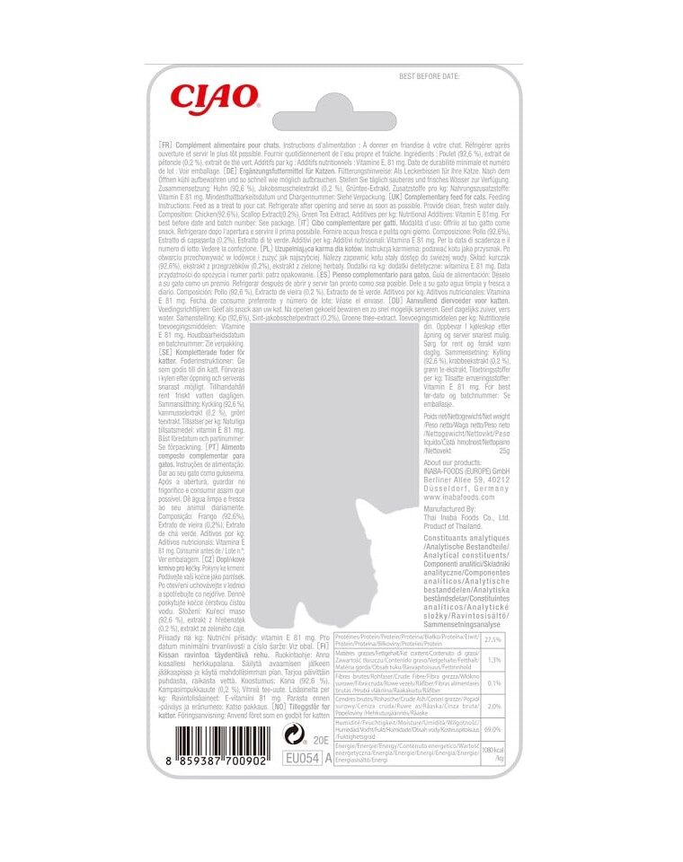 Sudėtis: vištiena (92,6 %), natūralus šukučių skonio sultinys (šukučių ekstraktas 0,2 %), žaliosios arbatos ekstraktas, maistiniai priedai: vitaminas E.
