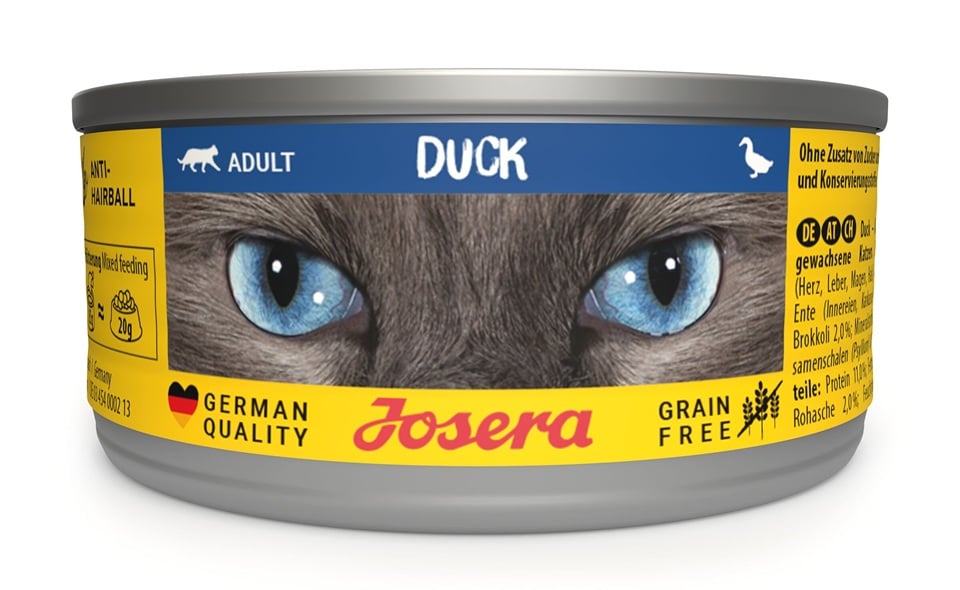 Kai jūsų augintinis su malonumu valgo maistą, jo šeimininkas taip pat yra patenkintas. Tai dar viena priežastis pasirūpinti skaniu dietos įvairove – pavyzdžiui, pasirinkus mūsų naują drėgną maistą Josera Duck skardinėje! Anties skonis paskatins valgyti net ir išrankiausias kates. Drėgnas maistas Duck skardinėje suteikia katėms didesnį skysčių kiekį, kas yra vertinga katėms, kurios nenoriai geria vandenį.