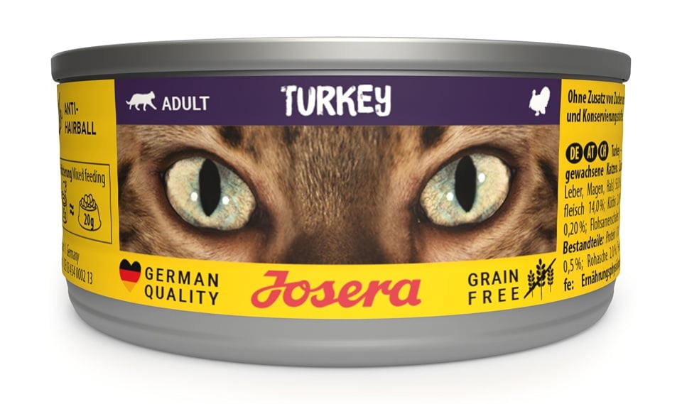 Mūsų gyvūnai turi daug pranašumų prieš mus - jie visada žino, ko nori valgyti. Naujas drėgnas maistas Josera Turkey yra paruoštas, skanus atsakymas į šiuos poreikius. Mūsų skanus patiekalas su kalakutiena turi begrūdę receptūrą ir puikų skonį. Dėl drėgnos struktūros katės, kurios nenoriai geria, gauna kartu su sultingu maistu didelį skysčių kiekį.