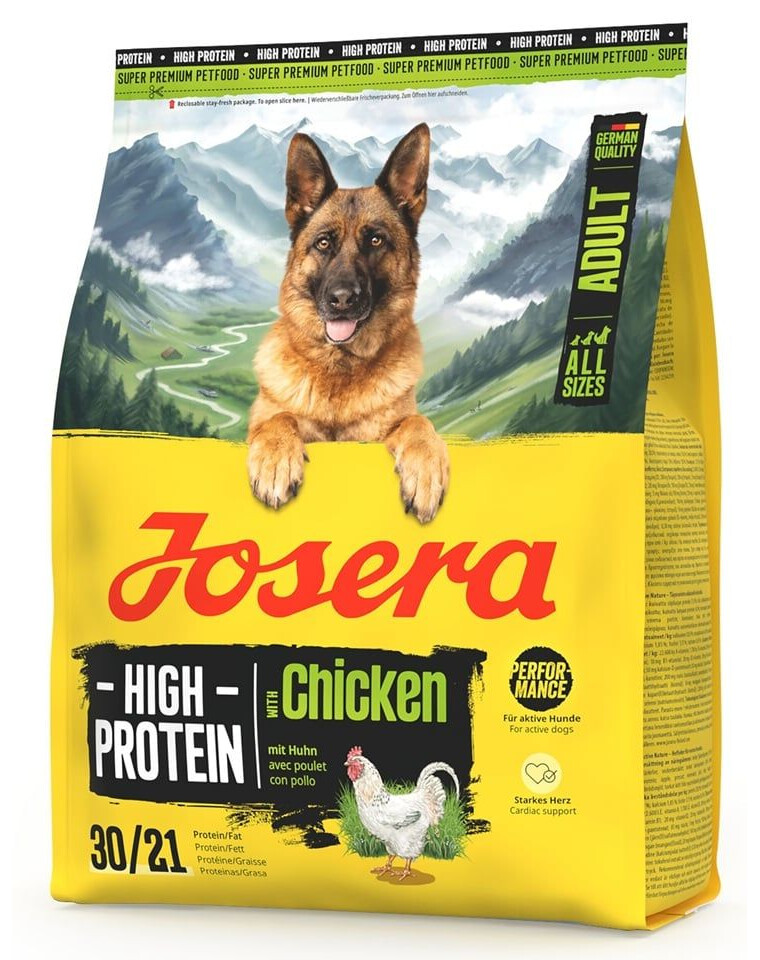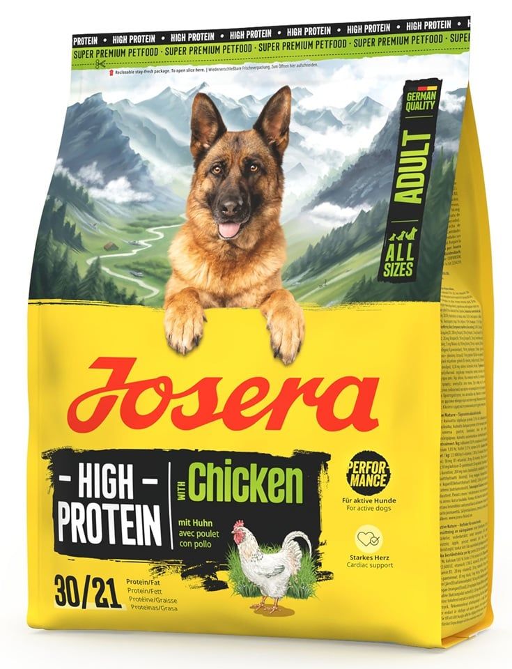 Visavertis, begluteniškas sausas maistas, sukurtas specialiai suaugusiems, labai aktyviems šunims visų veislių. JOSERA High Protein Adult Chicken yra aukštos baltymų ir aukštos energijos maistas, kuris suteikia optimalią energijos kiekį sportiniams šunims, dirbantiems ir nėščioms bei žindančioms kalėms. Vištienos, kaip lengvai virškinamo baltymo, ir kruopščiai parinktų maistinių medžiagų derinys palaiko ištvermę, jėgą ir greitą atsigavimą po fizinio krūvio.