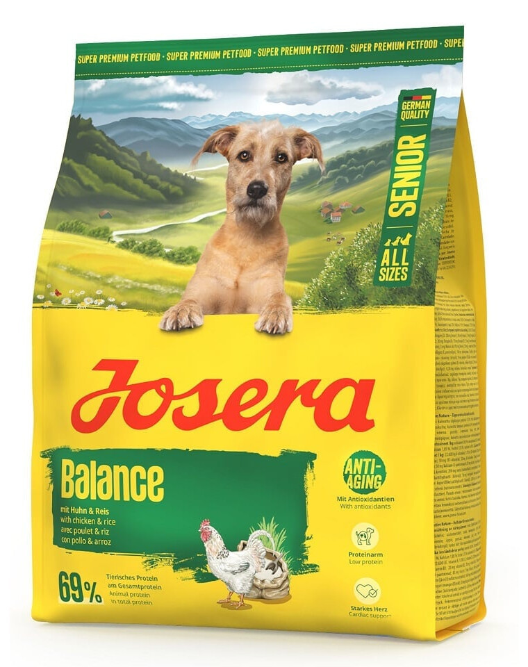 Pritaikytas senjorų šunų poreikiams: Josera Balance yra specialus maistas didesnei gyvybingumui vyresniame amžiuje. Sumažintas riebalų ir baltymų kiekis padeda sumažinti šuns metabolizmo apkrovą. Gerai toleruojama ir subalansuota formulė neturi glitimo ir gali padėti kovoti su ląstelių senėjimu, dėka vertingų antioksidantų, tokių kaip vitaminai E ir C bei taurinas. Kadangi Balance taip pat yra maistas šunims su mažu fosforo kiekiu, jis gali sumažinti organų apkrovą vyresniame amžiuje. Dėl savo specialios sudėties, mažai riebalų turintis maistas šunims taip pat gali būti gerai toleruojama alternatyva mažiau aktyviems šunims, kurie dar nepasiekė senjoro amžiaus. Kad maistas būtų skanus, jo receptūra apima skanią vištieną ir ryžius.