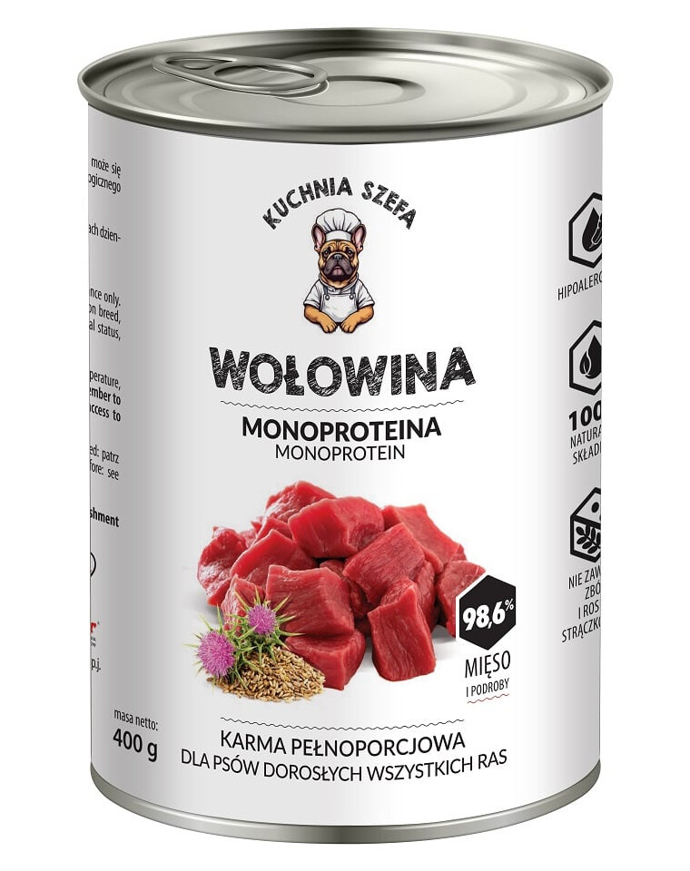 Kuchnia Szefa Jautiena Monoproteininė yra aukštos mėsos, visavertis maistas, paruoštas suaugusiems visų veislių šunims. Jame yra net 98,6% jautienos, įskaitant raumenų mėsą ir kruopščiai parinktus vidaus organus, kurie yra natūralus baltymų, vitaminų ir mineralų šaltinis. Dėl paprastos, monoproteininės sudėties produktas puikiai tinka šunims, turintiems jautrią virškinimo sistemą arba linkusiems į alergijas.