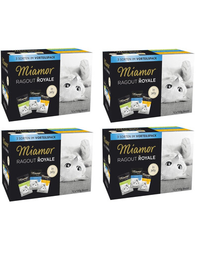 Miamor Ragout Royales Jelly 12×100g visavertis maistas, asortimentas: triušiena, tunas ir vištiena. Lengvai virškinami mėsos gabaliukai skaniame drebučių pavidalu suaugusioms katėms. Tai visavertis maistas, kuriame yra viskas, ko reikia jūsų katei. Pagamintas taikant gamybos procesą, kuris išsaugo žaliavų maistinę vertę ir vitaminus, todėl pramoninių vitaminų dedama saikingai. Sudėtyje nėra jautienos, dažiklių ir konservantų.