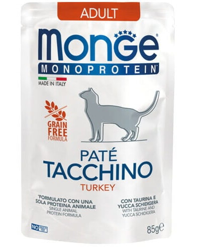 MONGE Monoprotein Adult Cat Paté Turkey yra subalansuota, pilnavertė maistas suaugusiems katėms, priklausanti unikalios linijos Monge Monoprotein Superpremium. Receptūra paremta vienu gyvūniniu baltymų šaltiniu – kalakutu, kuris pasižymi aukštu virškinamumu ir puikiu įsisavinimu.